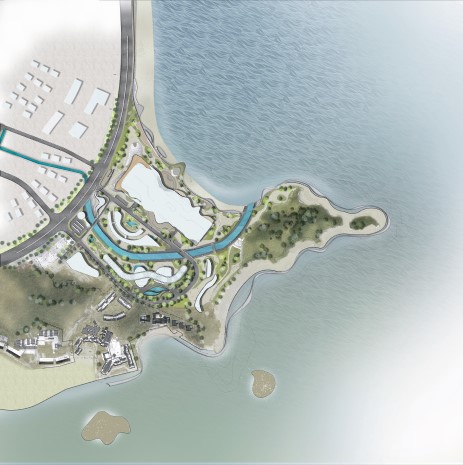 建筑主体沿海岸展开。根据项目特征,建筑被划分为四个体量——群众文化演艺中心、主题展览馆、培训创作区和市图书馆。它们面朝大海,创造出各种类型的共享空间,并且都拥有非常好的沿海景观。用地西北部靠近城市主干道,适合布置公共的集散广场,并为市民提供聚集活动的场所;用地东部紧贴半岛沙滩,提供了独特的海岸线景观。